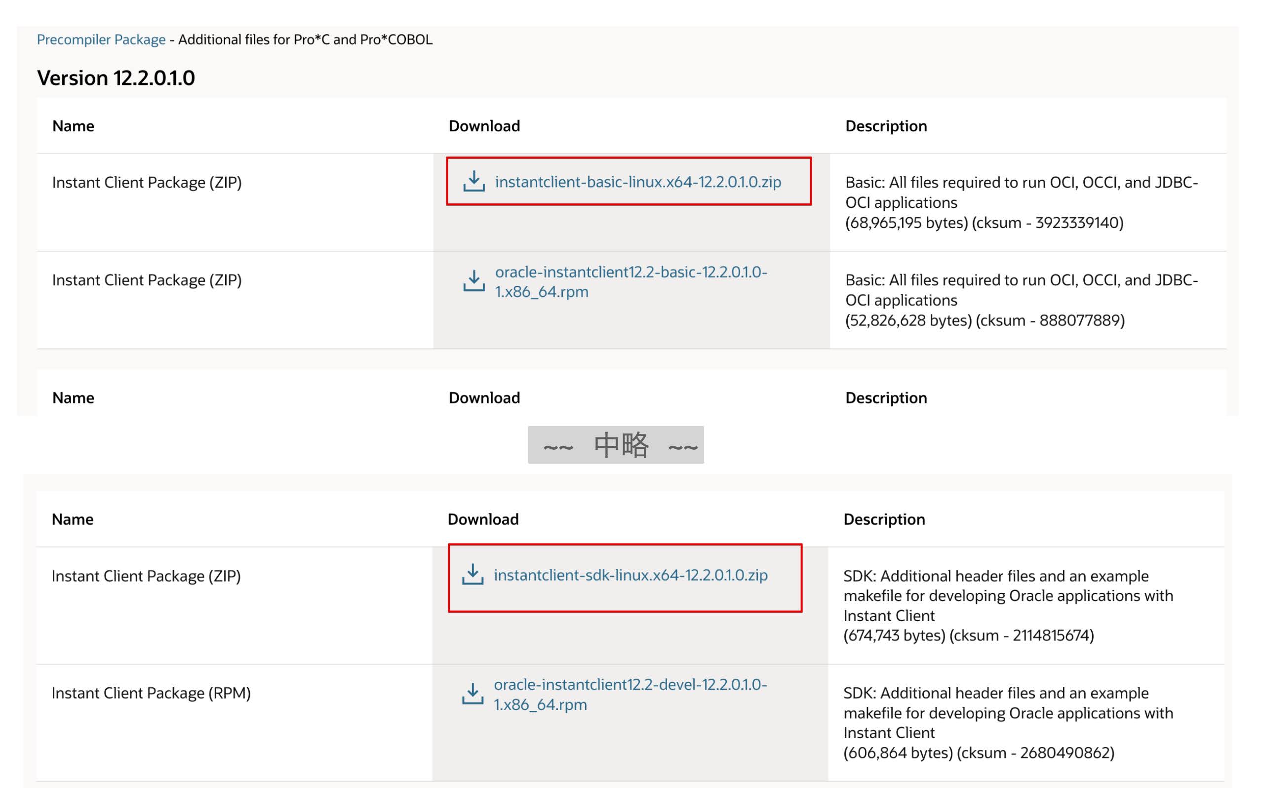 ダウンロードするのは「instantclient-basic-linux.x64-12.1.0.2.0.zip」と「instantclient-sdk-linux.x64-12.1.0.2.0.zip」の2つのファイルである。